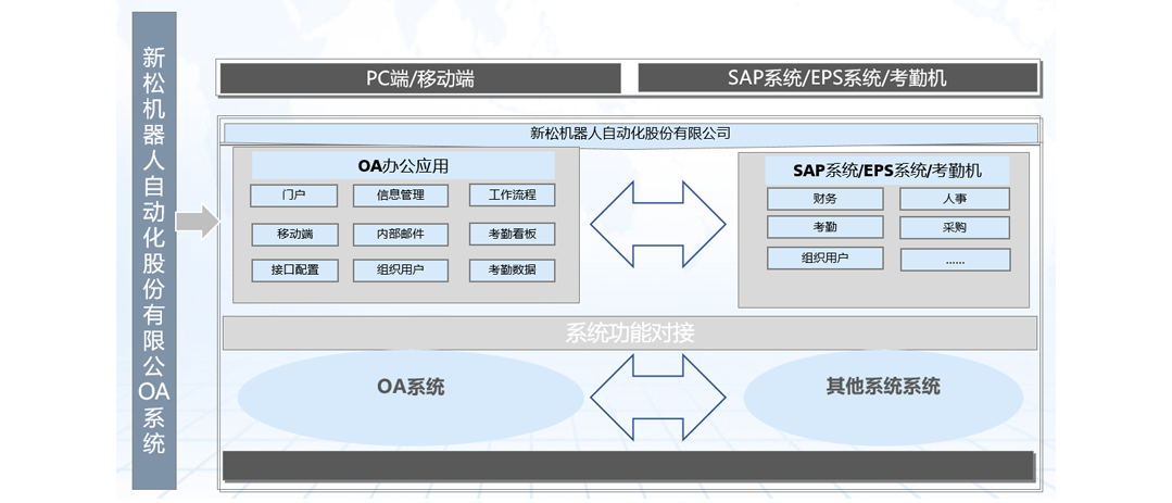 隨著新松信息化建設(shè)的不斷完善,多平臺的復(fù)雜操作以無法滿足當(dāng)前辦公的業(yè)務(wù)場景,需要一套系統(tǒng)能夠縮短辦公時長,提升辦公效率,既滿足對多平臺的數(shù)據(jù)進行整合對接,又包含高靈活度的開發(fā)空間,既滿足多個部門的當(dāng)前辦公業(yè)務(wù)場景,又滿足新松后續(xù)發(fā)展的業(yè)務(wù)拓展,故引進OA系統(tǒng),實現(xiàn)“單一系統(tǒng),多元化辦公”的目標。