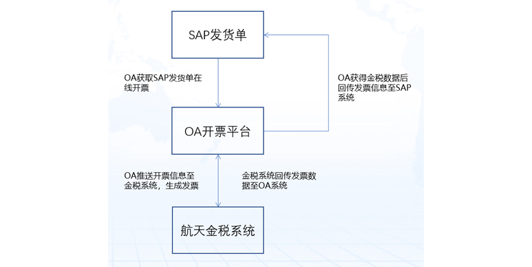 在線獲取SAP需開(kāi)票的發(fā)貨單;OA中可修改開(kāi)票信息,在線操作;OA中進(jìn)行合票拆票操作;OA點(diǎn)擊開(kāi)票進(jìn)行在線開(kāi)票;開(kāi)票數(shù)據(jù)同步金稅平臺(tái);開(kāi)票數(shù)據(jù)同步SAP系統(tǒng);