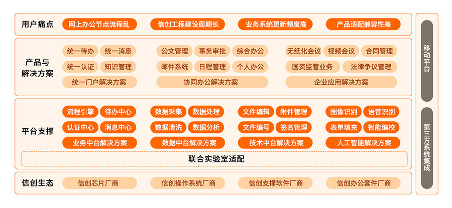 業(yè)務應用層面,基于PaaS低代碼定制平臺和集成連接平臺,以法律科技、教育信息化、企業(yè)服務等業(yè)務應用場景為價值驅(qū)動,提供行業(yè)化、個性化的業(yè)務應用管理解決方案和組織管理長尾應用,可滿足以國企為代表的各行業(yè)更深入的數(shù)字化轉(zhuǎn)型需求。