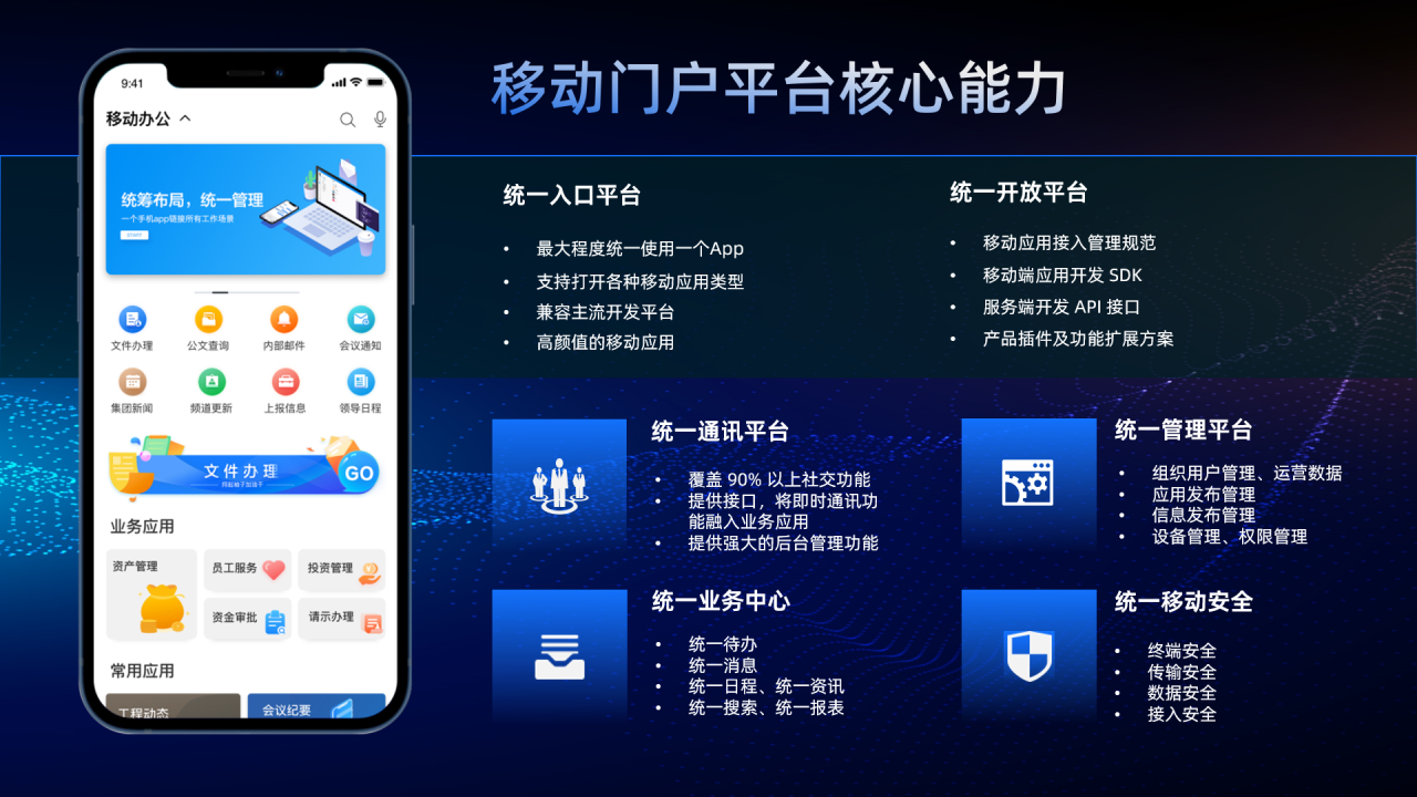 面向中大型企業(yè)客戶,打造可持續(xù)迭代的統(tǒng)一移動工作平臺,幫助企業(yè)覆蓋各種工作場景,平臺支持私有化、可定制,為企業(yè)建立具備差異化核心競爭力的賦能平臺,提供具備良好開放性、可統(tǒng)一管理、易于維護(hù)、基于數(shù)據(jù)運(yùn)營的移動化工作平臺。