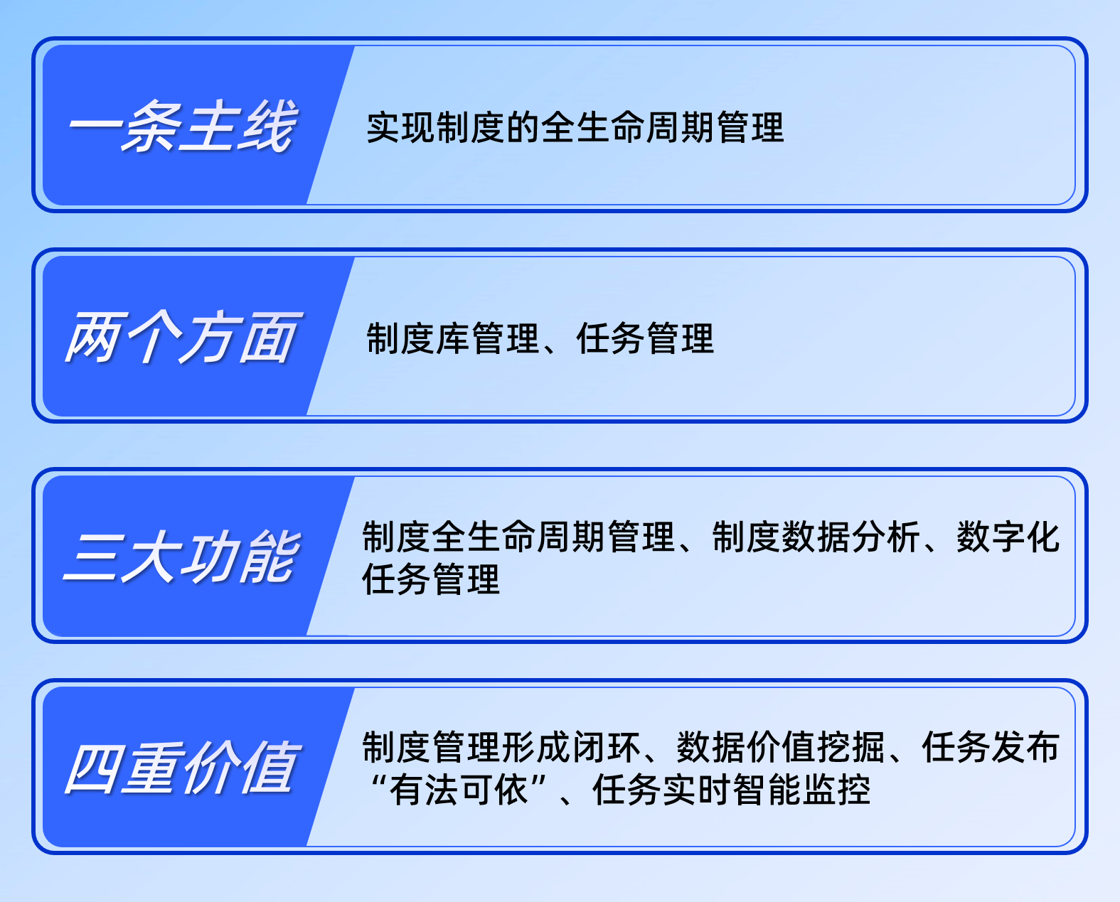 制度庫平臺不僅是簡單的“增刪改查”,而是從制度的場景入手,把流程再造、制度變革、機(jī)制完善協(xié)同起來,提升治理效能。